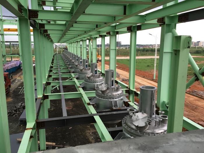 下圖為負(fù)極材料包覆自動化生產(chǎn)線安裝現(xiàn)場。一條國內(nèi)大型的負(fù)極包覆自動化生產(chǎn)線將會在這里建成。從包覆設(shè)備的設(shè)計和制造,再到設(shè)備安裝現(xiàn)場的各項設(shè)計與布置(設(shè)備方位、管道選型和走向、線路、配套設(shè)備等的布置),都是經(jīng)過精心設(shè)計的。高效穩(wěn)定的負(fù)極材料包覆生產(chǎn)線還需要配套好的自動化系統(tǒng),自然所選用質(zhì)量好的工控產(chǎn)品也是非常重要。由碩宸公司研發(fā)的新一代鋰電池負(fù)極材料包覆設(shè)備自動化系統(tǒng)將會在這里首次投入使用。目前公司的整套負(fù)極材料包覆設(shè)備在國內(nèi)已有多家負(fù)極材料生產(chǎn)企業(yè)投入使用,并取得了很好的效果。