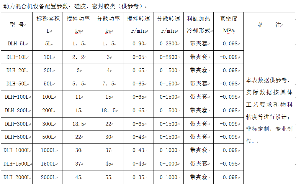 九、MS密封膠行星動力混合機(jī)|真空攪拌機(jī)配置參數(shù)表:(常規(guī)的容量、功率、轉(zhuǎn)速等數(shù)據(jù)表,其它更大容積的未作描寫)